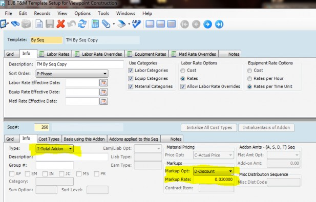 - Select the T&M Template that you wish to add a discount to in JB T&M Template Setup and add a new sequence.