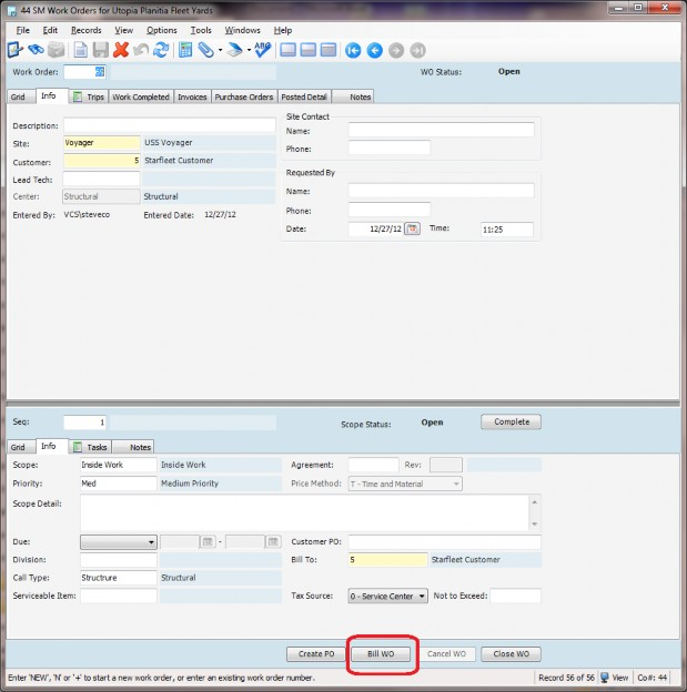 There are 2 ways to bill an SM Work Order. You can bill either from the WO itself or the SM Work Order Billing form.