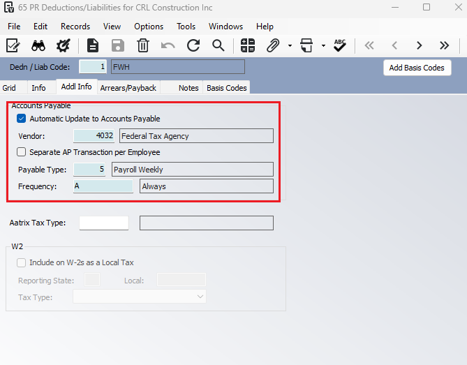 The first step is to check the box Automatic Update to Accounts Payable in PR Deduction/Liabilities, under Additional Info tab. You do not want this box checked if the deduction/liability is not to update AP.
