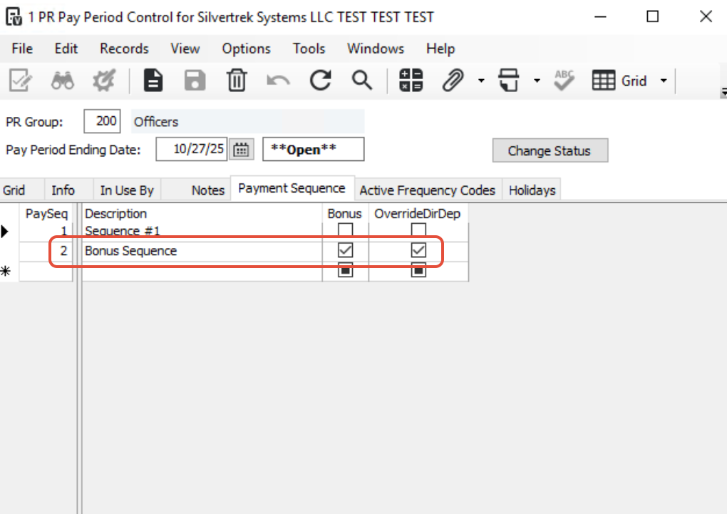 Pay Period Control → Payment Sequence tab (override Direct Deposit), or