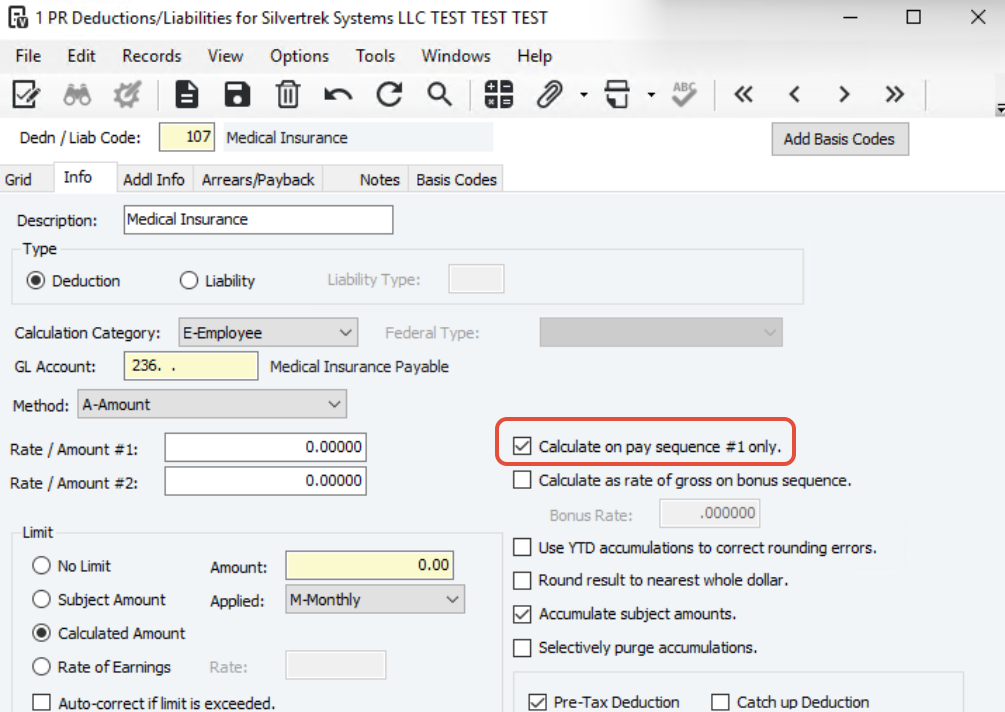 Check the box “Calculate on pay sequence #1 only” in PR Deductions/Liabilities.
