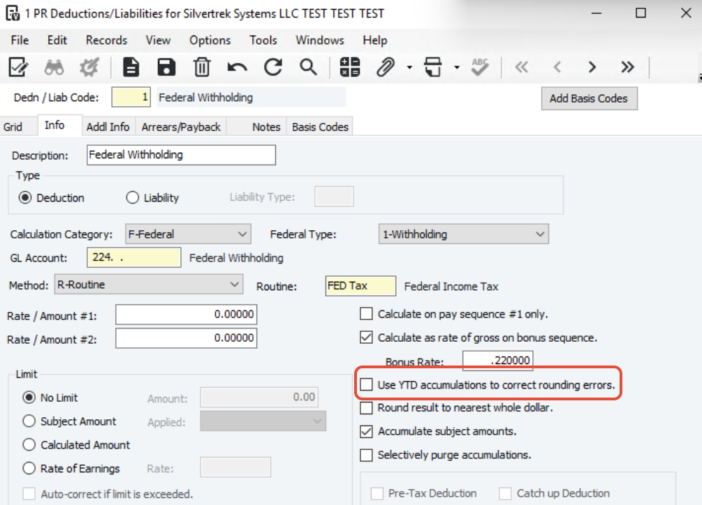For deductions like Federal Withholding Tax (FWT), ensure “Use YTD accumulations to correct rounding errors” is unchecked—especially when processing bonuses.