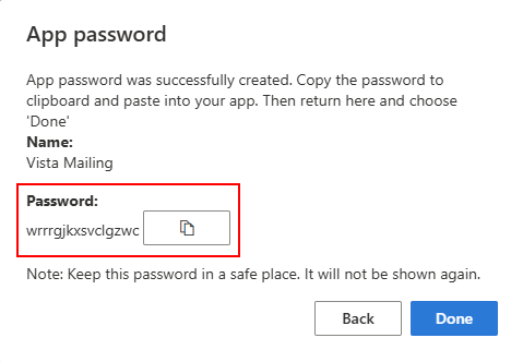 - The app password will be automatically generated. It will not be accessible again after this point, so make sure to save the password in a secure location.